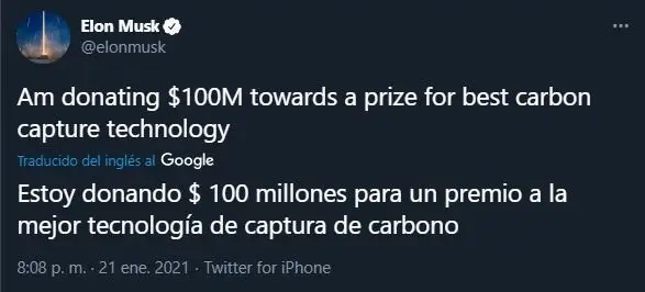 "Donaré un premio de US$ 100 a la mejor tecnología de captura de carbono", tuiteó. "Los detalles estarán la próxima semana", escribió en sus redes sociales.